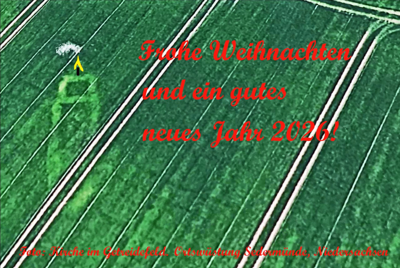 unsere weihnachtliche Grußkarte zeigt die ehemalige Kirche der Ortschaft Sedemünde als Abdruck im Getreide. Die Breite des Kirchenschiffs und des Turmes betragen etwa 5 Meter, die Gesamtlänge etwa 23 Meter. Vor gut 700 Jahren haben die Dorfbewohner hier das Christfest gefeiert. Und seit etwa 500 Jahren heißt es wie in Psalm 103: „wenn der Wind darüber geht, so ist sie nimmer da, und ihre Stätte kennet sie nicht mehr.“