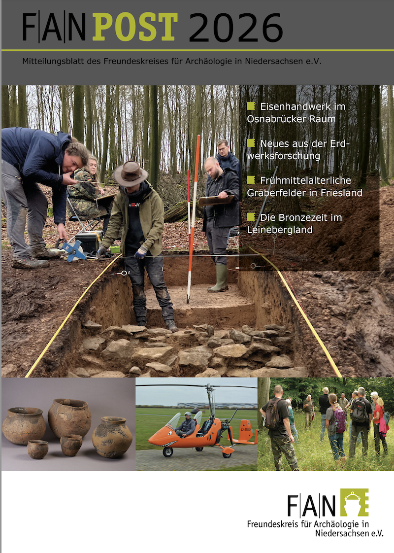 ![]() FAN-Newsletter Liebe Mitglieder im FAN, Herr Freese weist darauf hin, dass er aus privaten Gründen die Wanderung im Landkreis Verden am Samstag, den 28. März sowie die Exkursion zu den „Celtic Fields“ im Waldgebiet Süsing am Samstag, den 11. April in diesem Frühjahr nicht durchführen kann, sie finden voraussichtlich im Herbst oder im nächsten Jahr statt. Gestern ist die neue Ausgabe der FAN-Post verschickt worden. Sollte jemand die FAN-Post nicht erhalten haben, bitte Bescheid geben. Hier ist die Ausgabe online. ![]() FAN Fundarbeitsgruppe Das nächste Treffen der FAN Fundarbeitsgruppe findet am Dienstag, den 14. April um 13:00 Uhr im NLD statt. Aktuell fotografieren wir Funde aus der Sammlung Amme aus dem Leinetal. Bei Interesse bitte unter utz.boehner@nld.niedersachsen.de melden. Beste Grüße der FAN-Vorstand Freundeskreis für Archäologie in Niedersachsen e.V. c/o Niedersächsisches Landesamt für Denkmalpflege Scharnhorststr. 1 30175 Hannover https://freundeskreis-fuer-archaeologie.de |